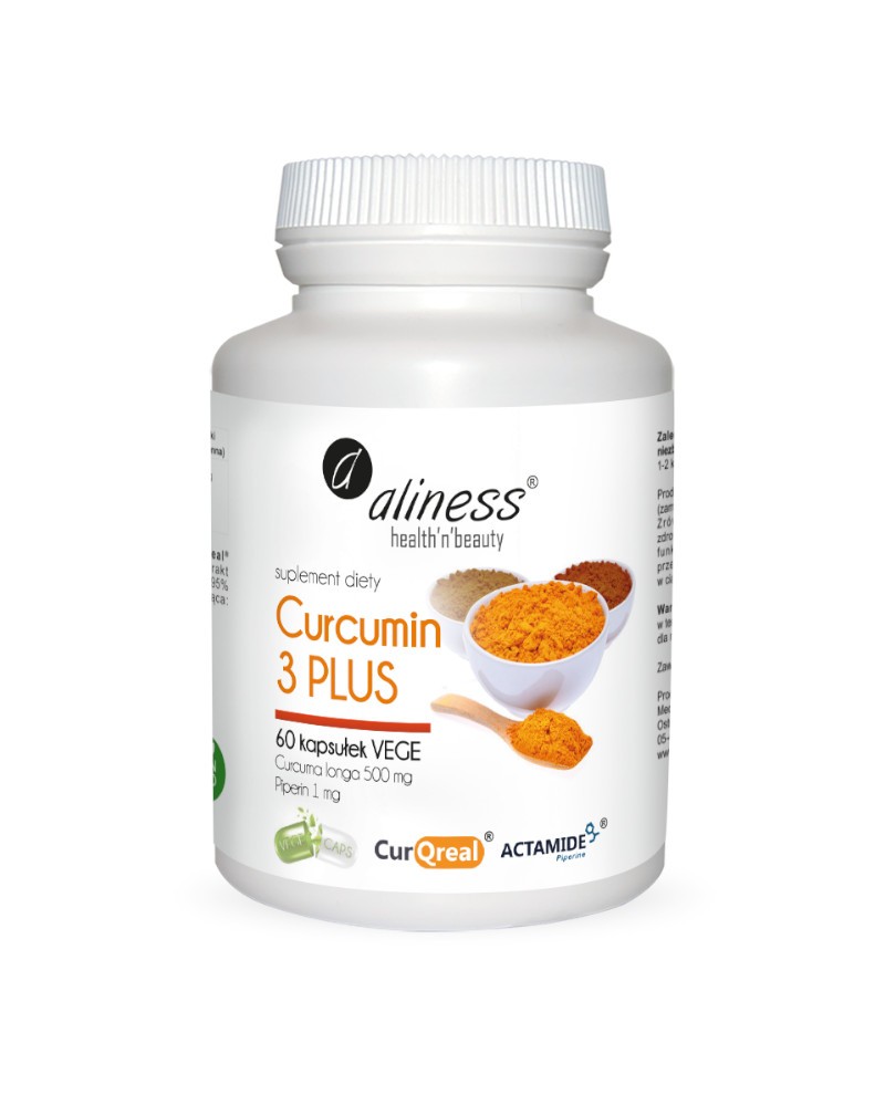 Aliness Curcumin 3 PLUS to kompozycja w 100% naturalnych kurkuminoidów, w postaci opatentowanego ekstraktu z kurkumy CurQreal®. W skład kompleksu wchodzą trzy związki chemiczne występujące naturalnie w kurkumie: kurkumina, desmetoksykurkumina (DMC) i bis-desmetoksykurkumina (BDMC). Aby zwiększyć biodostępność kurkuminoidów, skład wzbogacono o naturalny ekstrakt z pieprzu ACTAMIDE®, który zawiera 95% piperyny i jest pozyskiwany wyłącznie na drodze wodnej ekstrakcji.