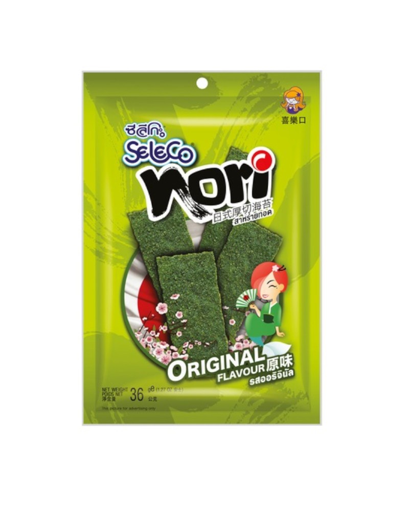Chrupiące glony wodorosty nori original przekąska w opakowaniu 36g firmy SELECO. Klasyczna chrupiąca przekąska w oryginalnym smaku wodorostów bez dodatków. Oryginalny smak charakterystyczny dla azjatyckich przekąsek, bardzo rzadko spotykanych w tradycyjnych sklepach.